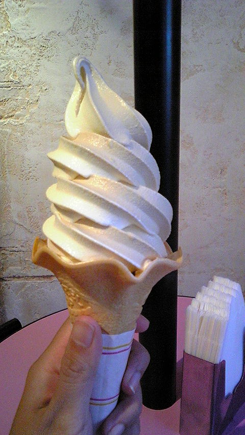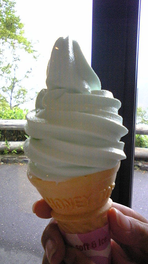 写真だとイマイチ分かりませんが、水色がかってるんですよ。このソフトクリーム。