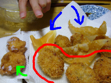 ・青の矢印はワンタンの皮を半分に切って揚げたもの。(塩を少しかけるとgood)